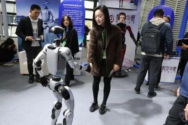 2024年“互联网之光”博览会上,观众与人形机器人互动。