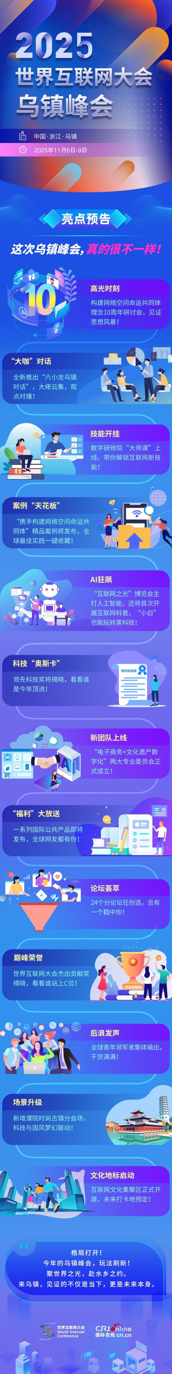 当千年文明对话前沿科技,一场关于数字未来的无限想象,正在这里展开。这是一场全球互联网的顶级盛会,更是一次未来之旅。今年“玩法”全面升级,更潮、更酷、更有料!锁定2025年乌镇峰会,一起定义未来!