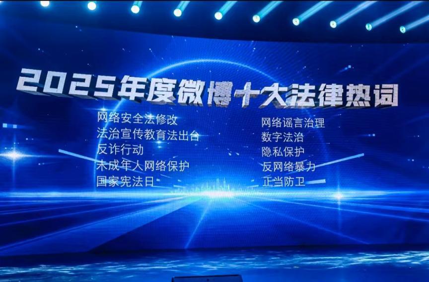 活动现场还发布了“2025年度微博十大法律热词”,分别是:网络安全法修改、网络谣言治理、法治宣传教育法出台、数字法治、反诈行动、隐私保护、未成年人网络保护、反网络暴力、国家宪法日、正当防卫。