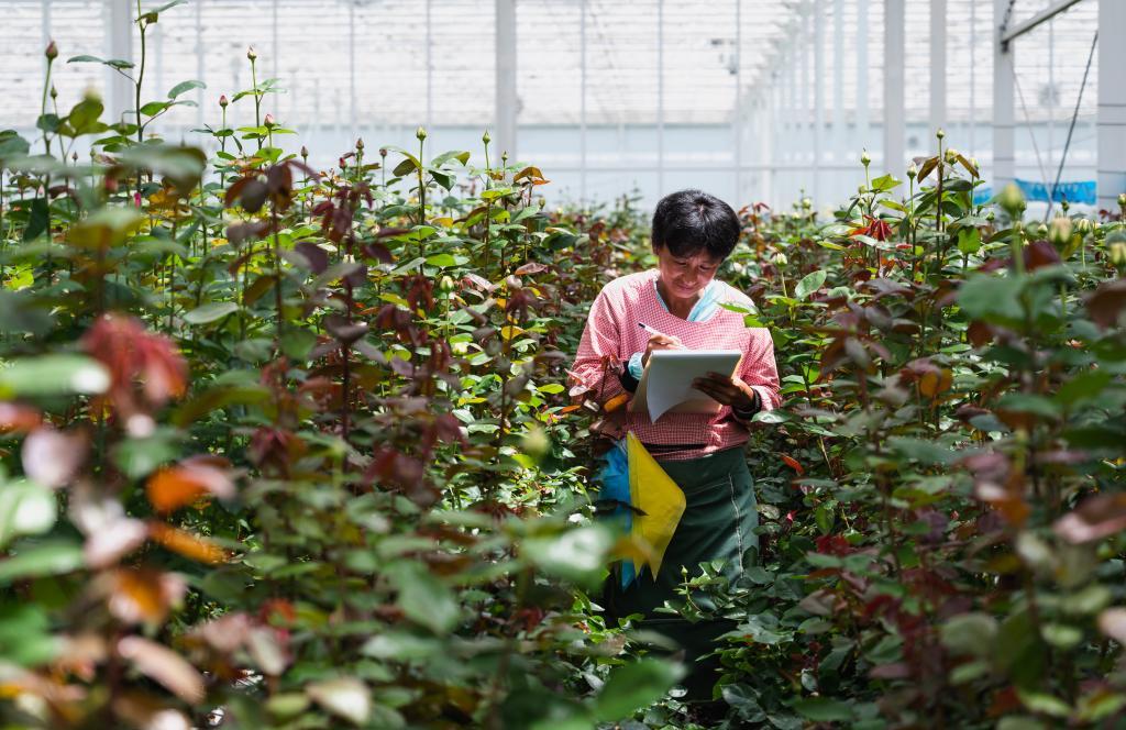 工作人员在丽江现代花卉产业园内记录鲜花生长状况。新华社记者王冠森 摄