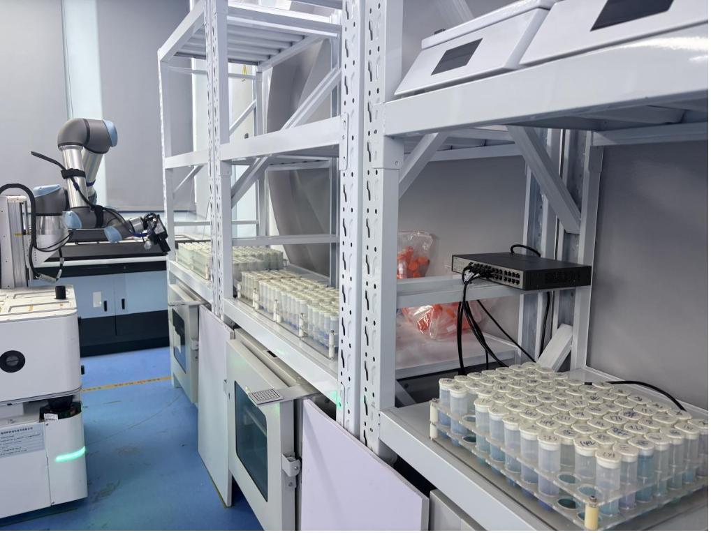在实验桌前,一名“智能科学家”正抬起结实的机械臂抓取试管,依次走过液体进样台、磁力搅拌台、烘干工作台,进行样品称重、搅拌、离心、烘干……
