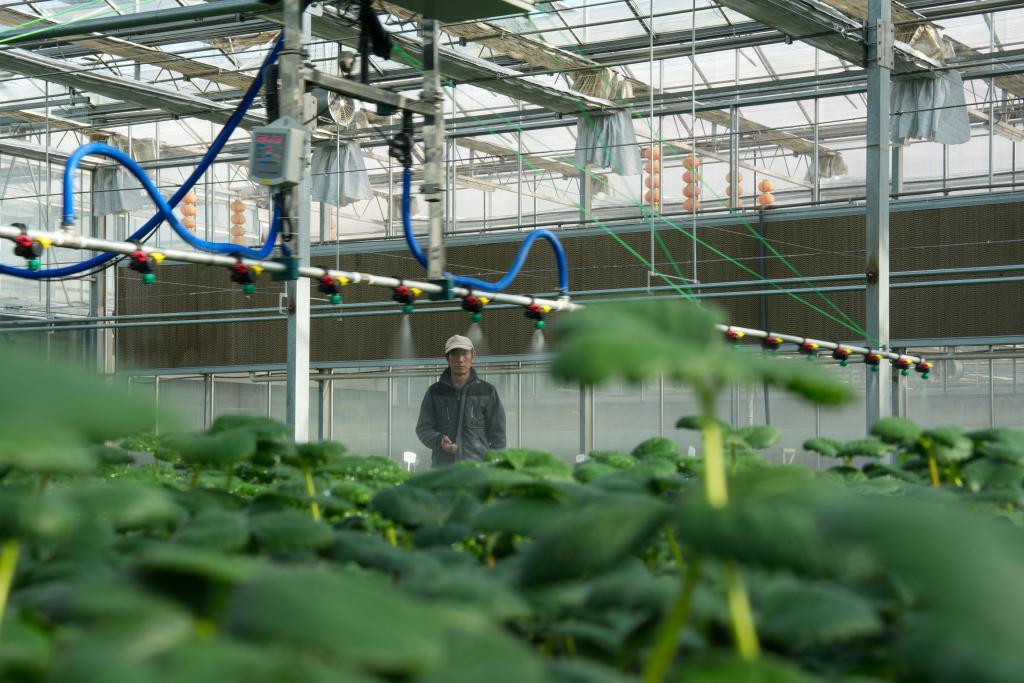 在青海省西宁市湟中区,工作人员正在利用水肥一体化设备给草莓种苗浇水。新华社记者杜笑微 摄