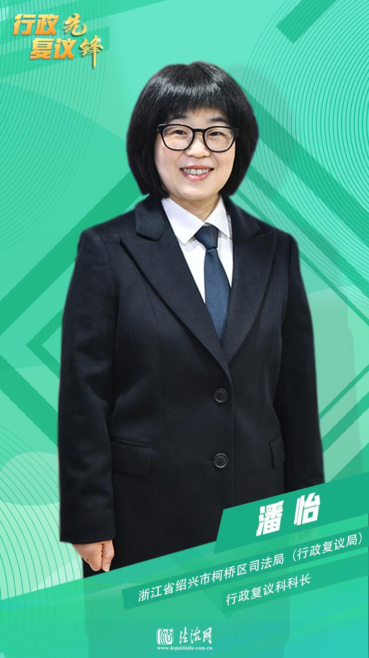 23年来,潘怡始终坚守在行政复议一线,办理过大批疑难复杂案件,经手的行政复议、行政诉讼多达4000余件,为上万名当事人解决纠纷,实现80%以上行政争议成功调撤,95%行政争议息诉罢访,并先后获得“浙江省行政复议工作先进个人”“全省行政复议规范化建设工作成绩突出个人”“个人三等功”等荣誉。
