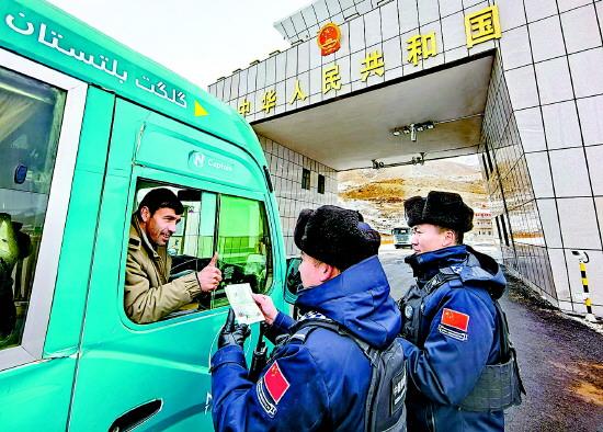 在执勤现场采访的记者已冻得瑟瑟发抖,拿着采访本的手指变得麻木僵硬,只好不停地跺着脚。张雷赶紧从备勤室里拿来一件厚重的大衣给记者披上:“这里风大,一分钟就能把人吹透。但你看这客车和货车一趟趟驶过,在寒冬里,中巴两国的人员和贸易往来火热,我们再辛苦也值啊。”