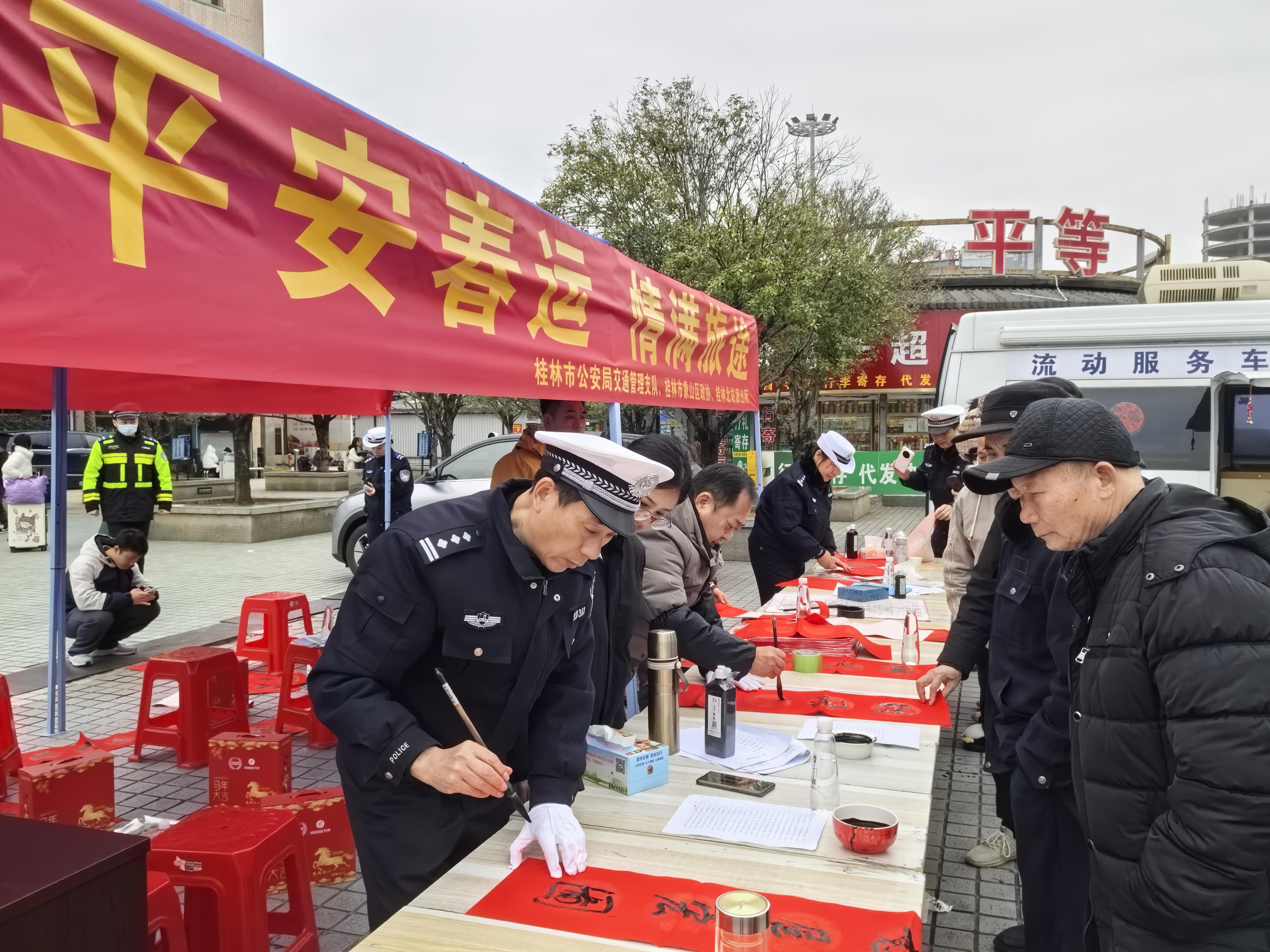 桂林市公安局交管支队民警在“平安春运 情满旅途”主题活动现场,为旅客现场书写交通安全春联。