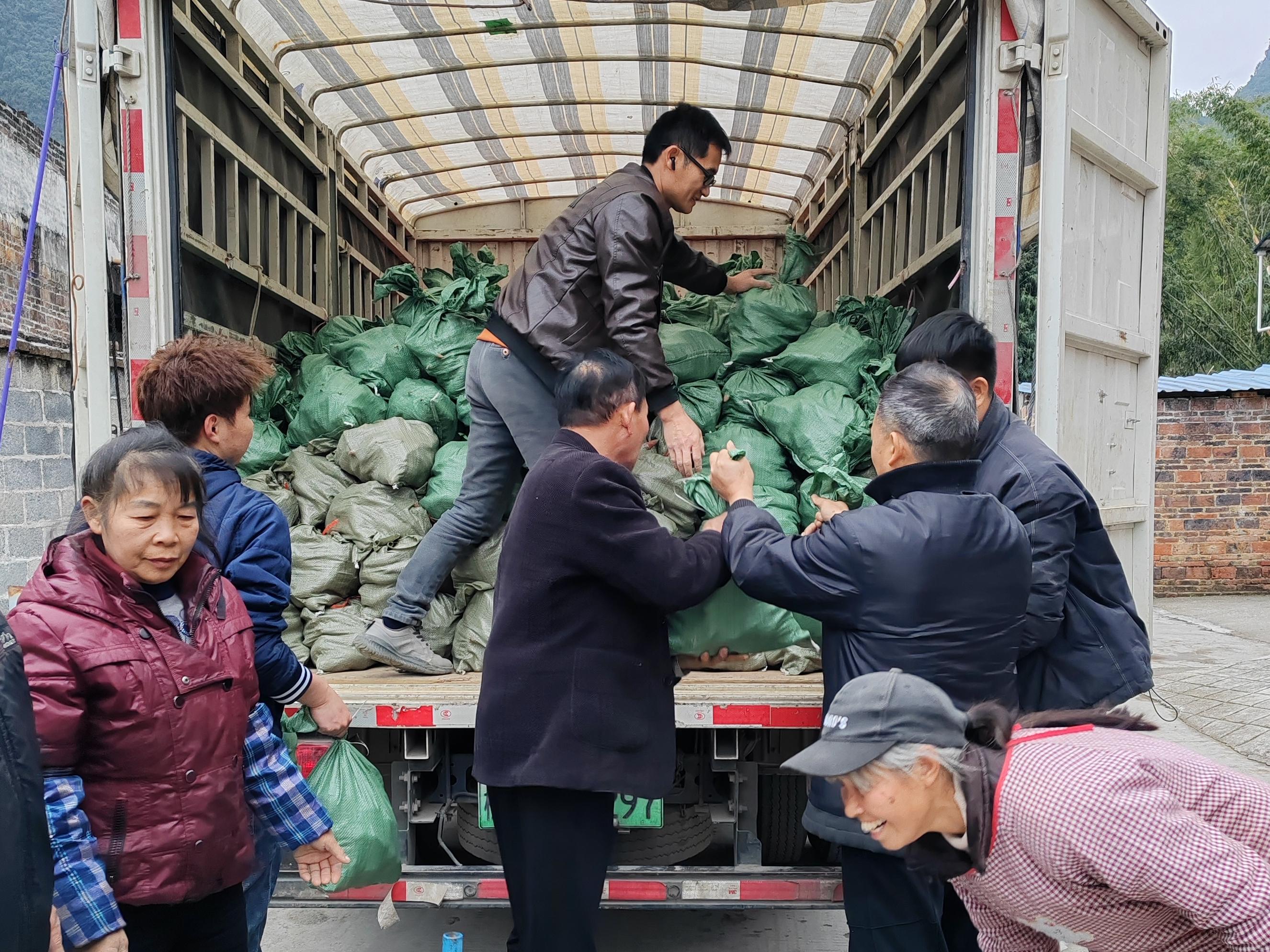 图为广西壮族自治区监狱管理局派驻龙腾村第一书记韦国党(右二)帮助村民将销售的红薯装上货车。韦昱洲 摄
