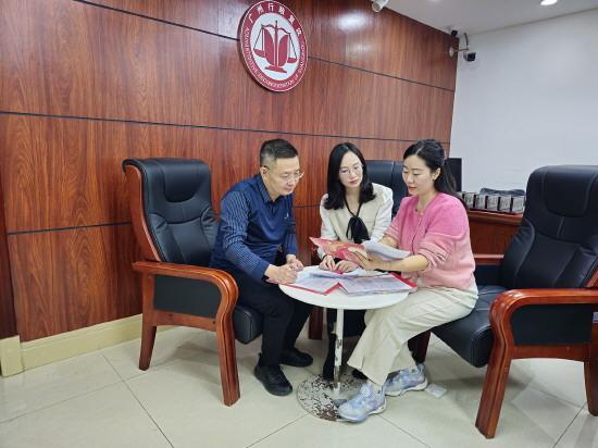 图为周秋妤(右一)和同事一起对疑难复杂案件进行合议,研究实质化解行政争议路径。广州市司法局供图