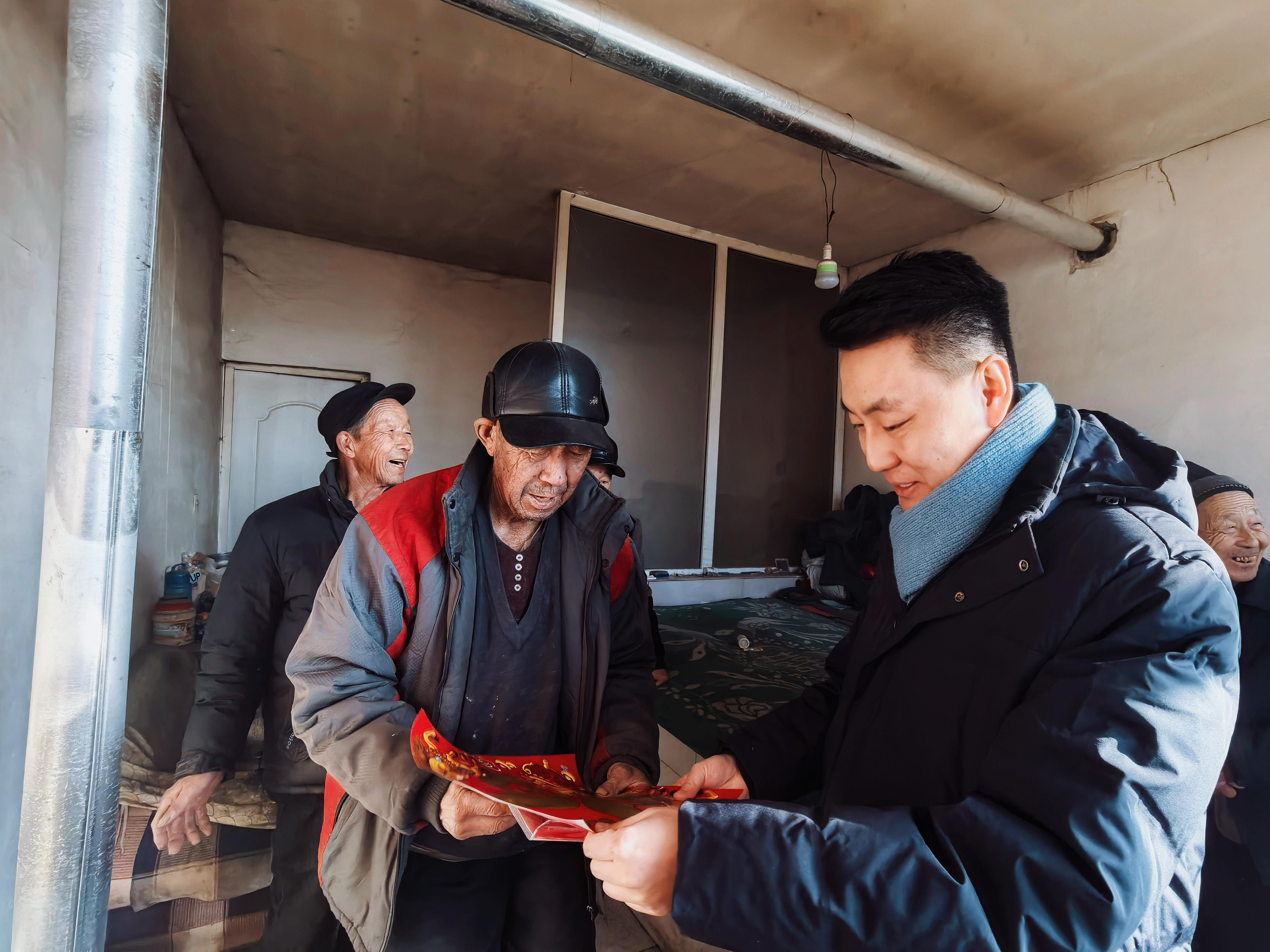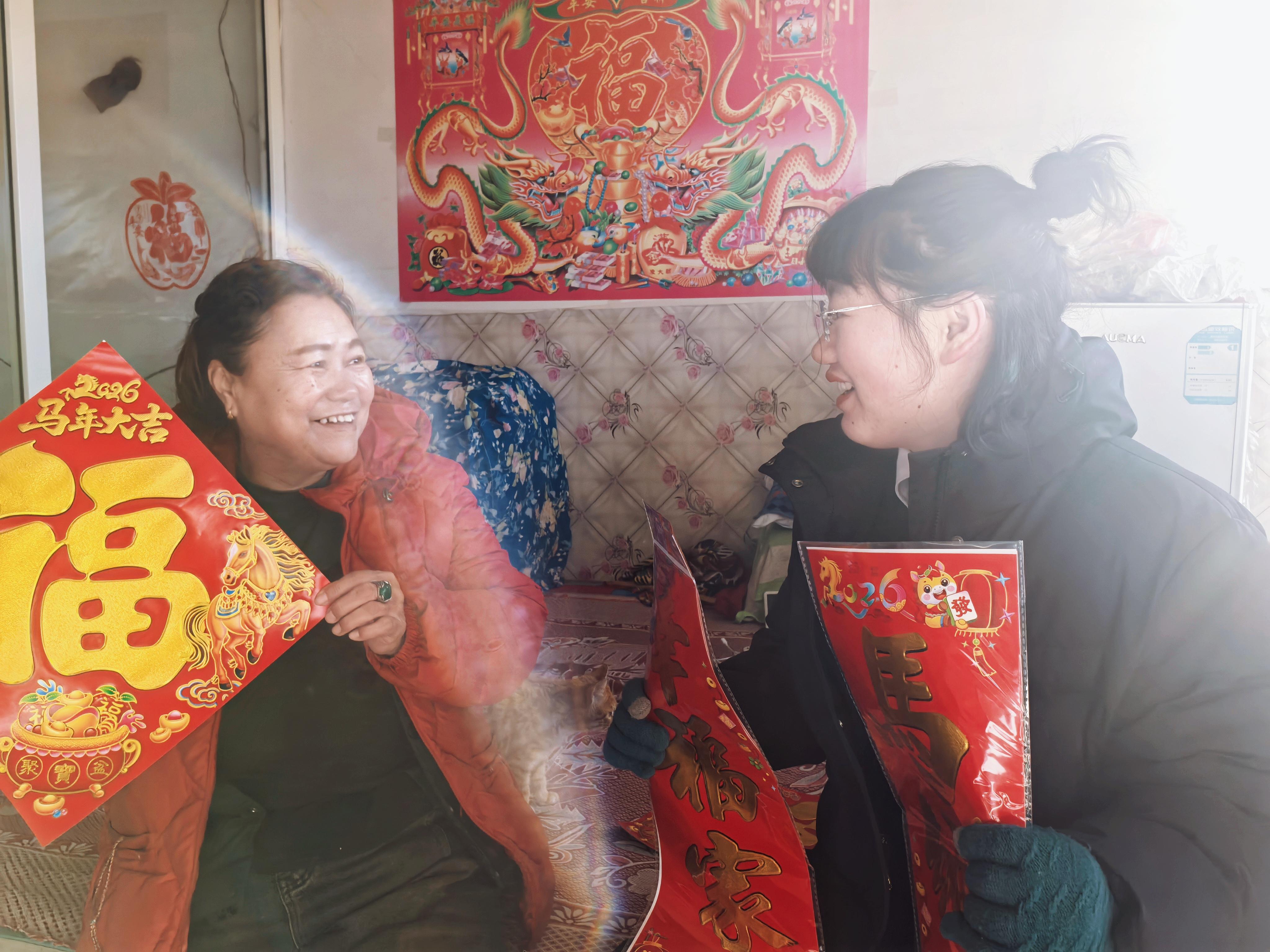 穿过小院,检察人员小燕走进张秀莲大妈的房间,红底金字的春联在朴素的屋里格外亮眼。“张大妈,这副‘福满桑榆添寿喜,春融检察送安康’,您瞧瞧合心意不?”小燕展开春联,大妈连忙拉着她上炕暖和:“你们一来,屋里就热闹了,比亲人还贴心!”红纸映着老人的笑脸。大妈摩挲着福字念叨:“还是你们想的周到,我都好几年没去市集了,这年味儿一下就足了!”