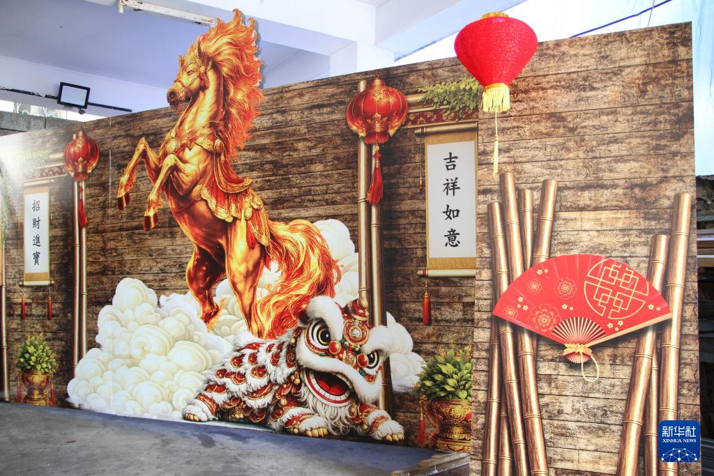 这是2月11日在毛里求斯首都路易港花车工作室拍摄的以中国农历马年为主题的花车展板。新华社发(阿利·素拜摄)