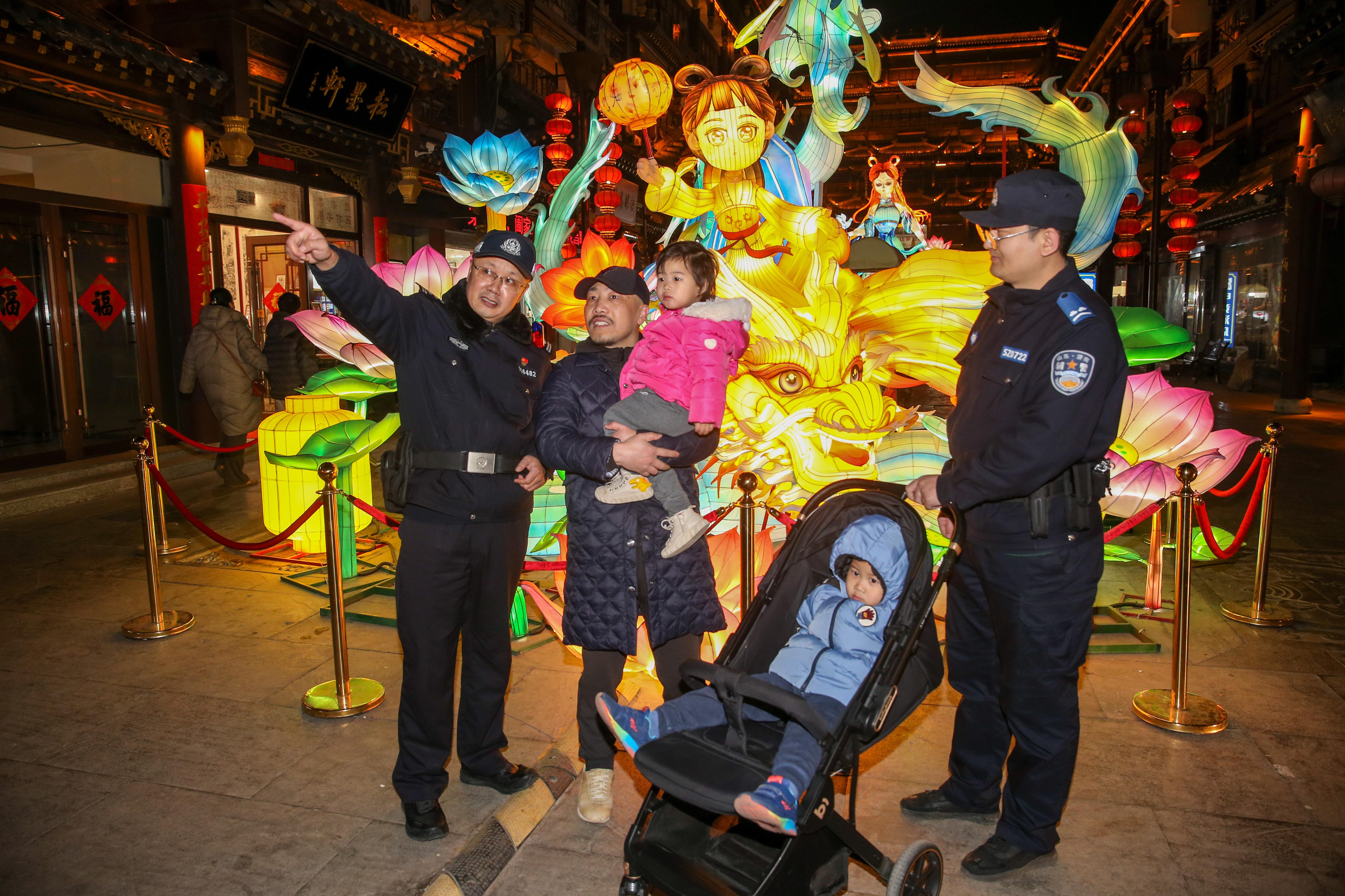 2月25日,山东省济南市公安局市中分局大观园派出所民警在大观园迎春灯会现场执勤巡逻,排查安全隐患,为游客提供服务,确保市民度过一个平安喜乐的元宵佳节。