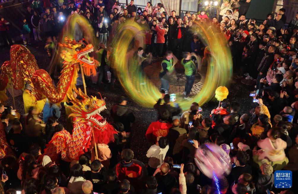 2月27日,村民在湖北省宣恩县高罗镇歌乐城社区进行舞龙表演。