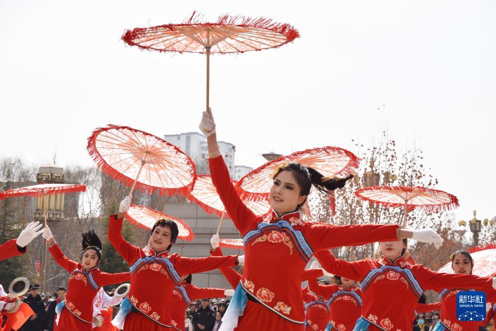 3月1日,秧歌队员在甘肃省和政县表演秧歌(无人机照片)。