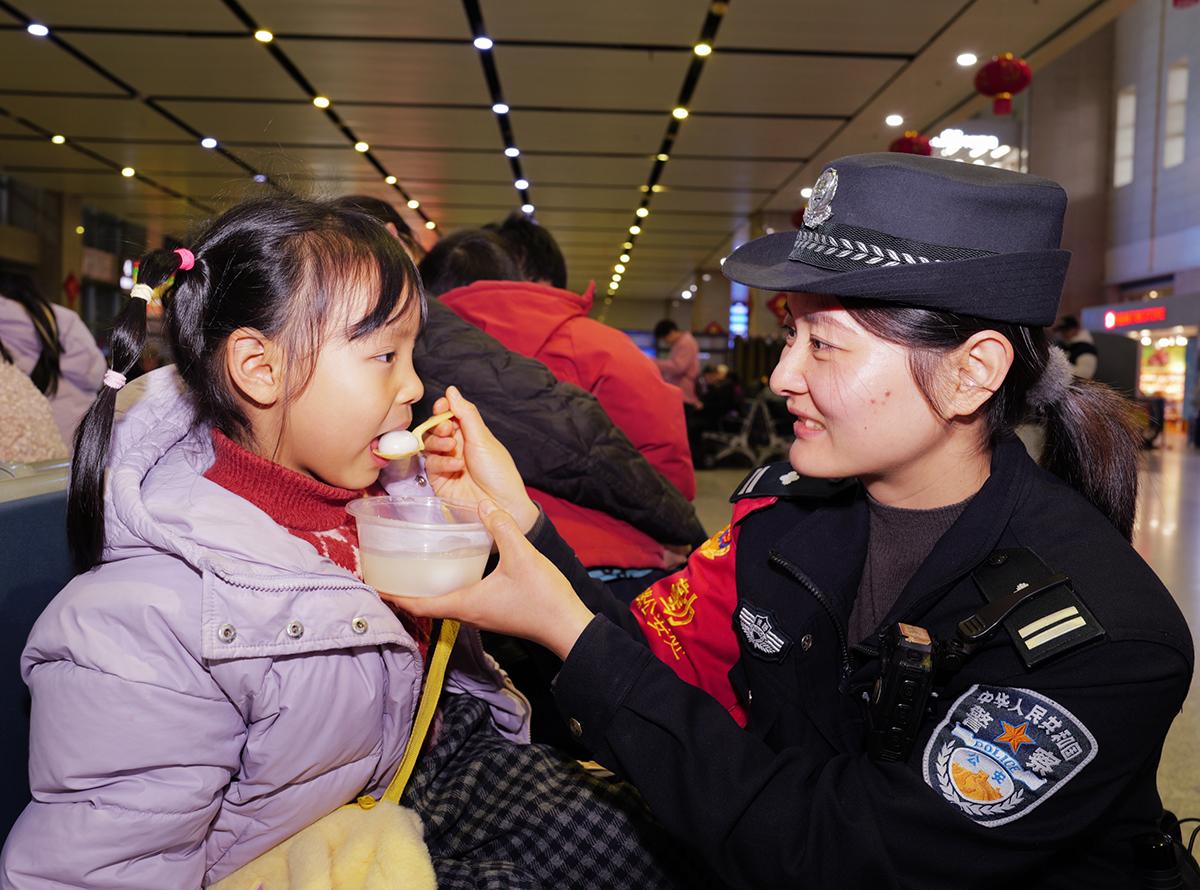 3月2日,湖北省宜昌东站迎来了春运返程客流高峰。武汉铁路公安局襄阳公安处宜昌东站派出所民警将汤圆送到候车室,与旅客共庆元宵佳节,并开展法治宣传。