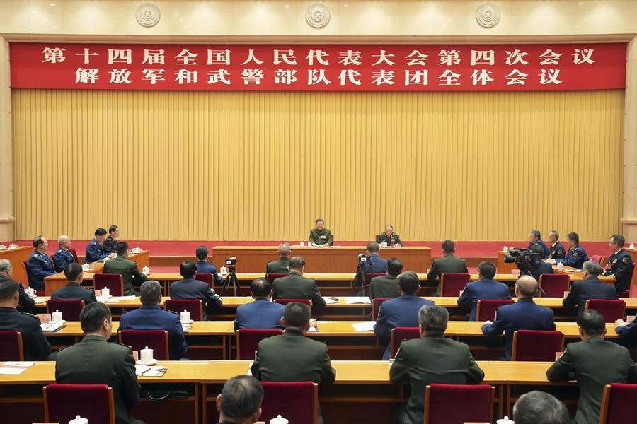 3月7日下午,中共中央总书记、国家主席、中央军委主席习近平出席十四届全国人大四次会议解放军和武警部队代表团全体会议并发表重要讲话。新华社记者 李刚 摄