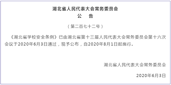 6月3日,湖北省十三届人大常委会第十六次会议审议并全票通过了《湖北省学校安全条例》(以下简称条例),并将于8月1日开始实施。湖北省人大相关负责人对条例进行了详细解读,特别是在广大市民关心的校园安全方面,条例在9大方面做出了详尽的规定,为学生安全加上多重保险。