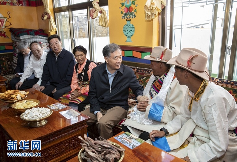 7月6日至8日,中共中央政治局常委、全国政协主席汪洋在西藏调研。这是7月6日,汪洋在日喀则桑珠孜区江当乡郭加新村易地扶贫搬迁集中安置点藏族搬迁群众家中看望。 新华社记者 黄敬文 摄