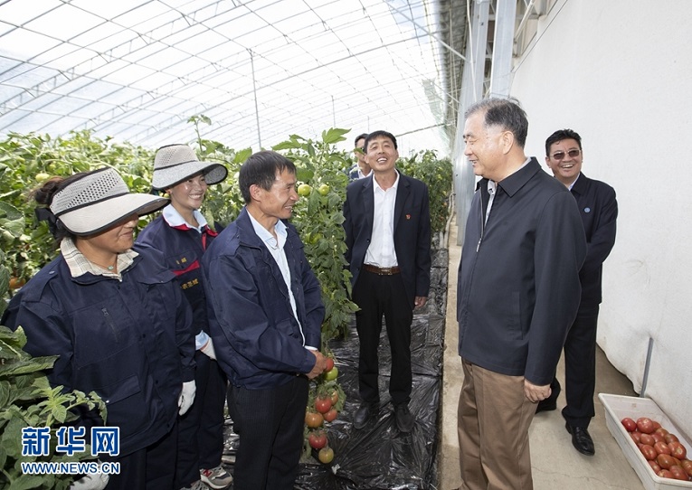 7月6日至8日,中共中央政治局常委、全国政协主席汪洋在西藏调研。这是7月7日,汪洋在日喀则白朗县察看果蔬种植,与务工群众交流。 新华社记者 黄敬文 摄