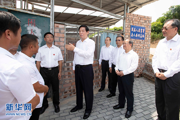 7月12日至15日,中共中央政治局常委、全国人大常委会委员长栗战书率全国人大常委会执法检查组在广西检查野生动物保护法和全国人大常委会关于全面禁止非法野生动物交易、革除滥食野生动物陋习、切实保障人民群众生命健康安全的决定的实施情况。这是7月15日,栗战书在百色市田阳区了解蛇类人工繁育养殖情况。 新华社记者 李涛 摄
