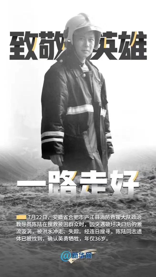 7月18日至21日,合肥市普降暴雨,庐江县遭受百年一遇的洪灾,多条河流水位超过历史峰值。庐江县人大代表、县人大社会建设委员会委员、县消防救援大队政治教导员陈陆带领消防救援大队指战员辗转5个乡镇,奋战96小时,成功转移和救出群众2665人。7月22日,庐江县石大圩漫堤决口,导致4个村庄、5.8平方公里被淹,约6500人被洪水围困,情况危急。陈陆不顾个人安危,多次乘坐橡皮艇往返搜救被困群众。营救过程中,决口突然扩大,所乘橡皮艇被卷入激流漩涡侧翻,他和当地向导、庐江县同大镇连河村党支部副书记王松被洪水冲走、失联。经49小时全力搜救,24日下午,在事发处下游约2.3公里水域发现一具遗体。经公安机关DNA比对,26日确认陈陆同志英勇牺牲。