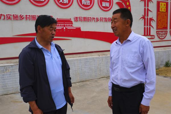 毕生忠代表(右)和大史家村村委会主任任永寿一起探讨村“两委”班子建设情况。摄影/李贝贝
