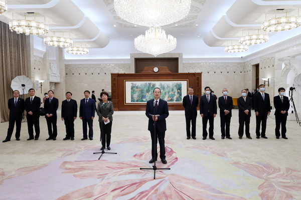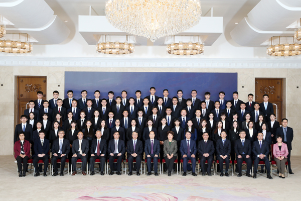 全国人大常委会秘书长、机关党组书记杨振武与机关党组成员、副秘书长同新录用工作人员合影。摄影/毕楠