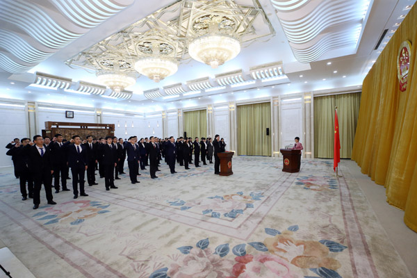 新录用工作人员进行宪法宣誓。摄影/许麟