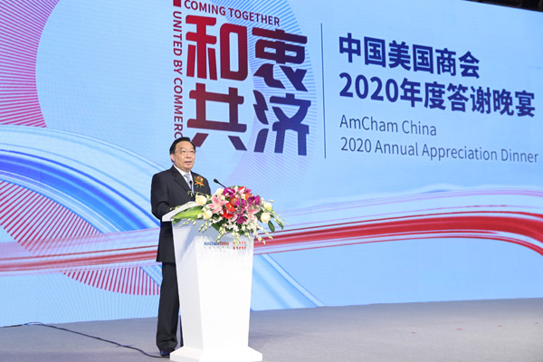 王晨指出,中国将全面贯彻新发展理念,坚持实施更大范围、更宽领域、更深层次对外开放,持续构建市场化、法治化、国际化营商环境,全面实施外商投资法,放宽市场准入,对在中国注册的企业一视同仁,完善公平竞争环境,实现互利共赢。这将为各国企业在华发展带来新机遇。在中国抗疫过程中,中国美国商会及其会员企业慷慨解囊,捐资捐物,中方对此表示感谢。希望中国美国商会及其会员企业继续充分发挥积极作用,为推动两国关系重启对话、重回正轨、重建互信作出努力。