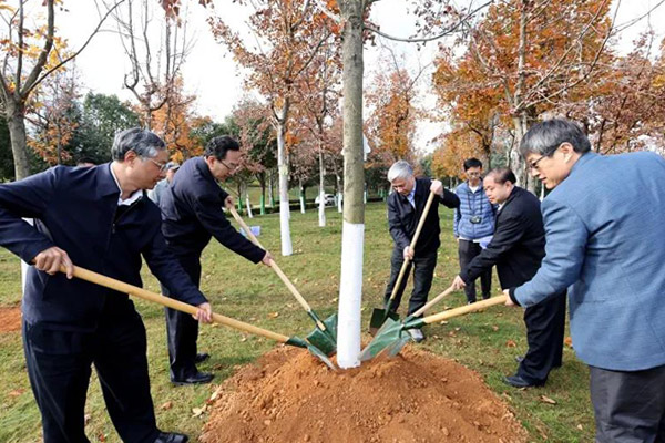 全国人大常委会副委员长、民盟中央主席丁仲礼率调研组在滇调研水污染防治和高原湖泊保护治理等工作。图为在云南大学呈贡校区,丁仲礼种下了一棵枫香树。云南民盟供图。