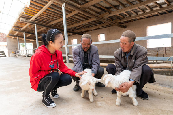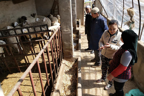 甘肃省人大代表尹建敏(左一)在和贫困户交流养羊情况。(尹建敏供图)