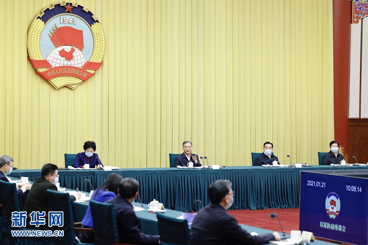 1月21日,十三届全国政协第46次双周协商座谈会在北京召开。中共中央政治局常委、全国政协主席汪洋主持会议。 新华社记者 刘彬 摄