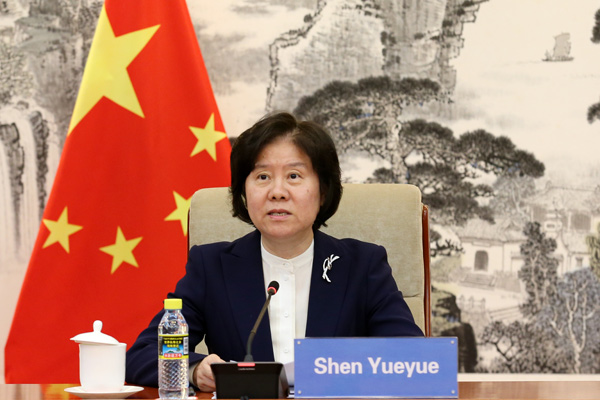 3月19日,全国人大常委会副委员长沈跃跃在京与新西兰议会副议长鲁拉斐举行视频会晤。摄影/毕楠
