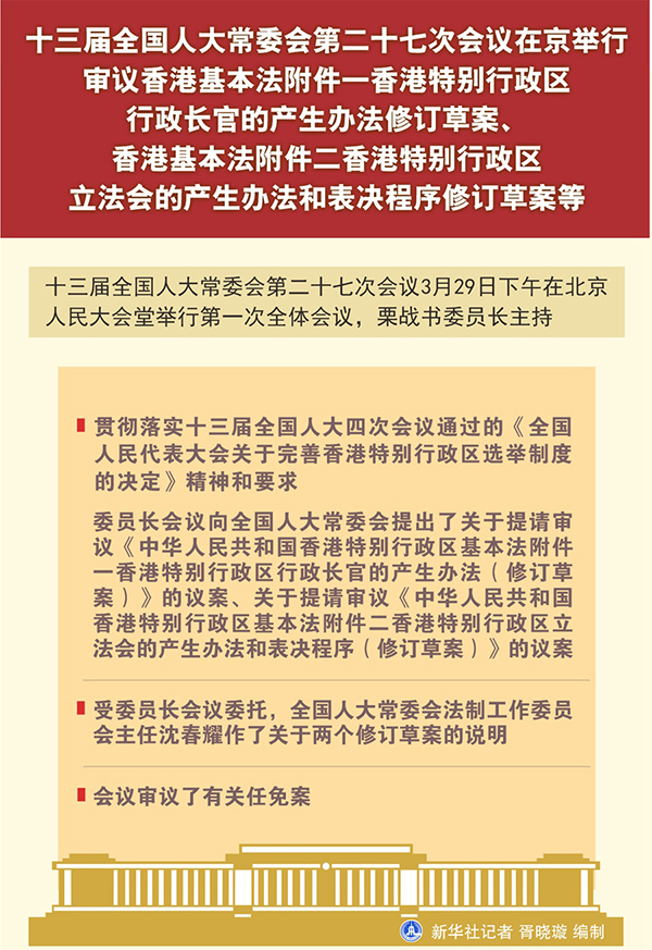 图表:十三届全国人大常委会第二十七次会议在京举行 审议香港基本法附件一香港特别行政区行政长官的产生办法修订草案、香港基本法附件二香港特别行政区立法会的产生办法和表决程序修订草案等 新华社记者 胥晓璇 编制
