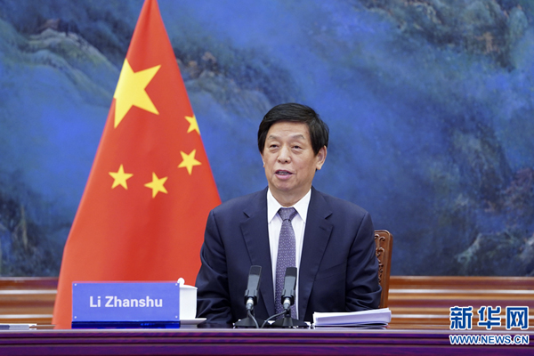 全国人大常委会委员长栗战书31日在北京人民大会堂以视频方式同蒙古国国家大呼拉尔主席赞丹沙塔尔举行会谈。