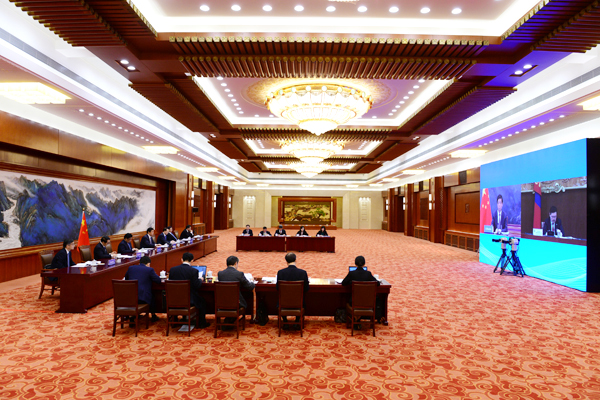3月31日,全国人大常委会委员长栗战书在北京人民大会堂以视频方式同蒙古国国家大呼拉尔主席赞丹沙塔尔举行会谈。马增科 摄