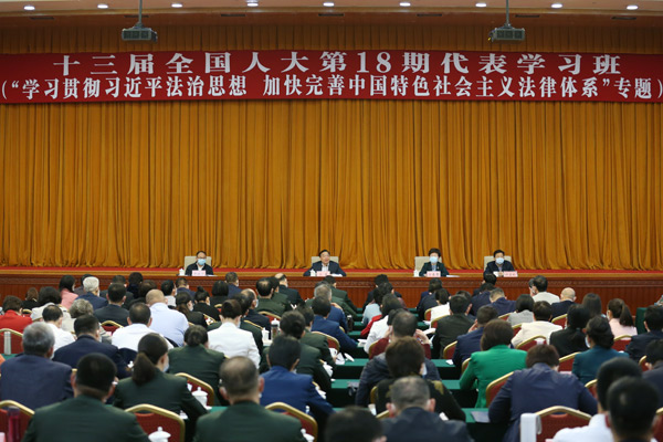 4月20日,中共中央政治局委员、全国人大常委会副委员长王晨出席十三届全国人大第18期代表学习班并作学习贯彻习近平法治思想专题报告。毕楠 摄