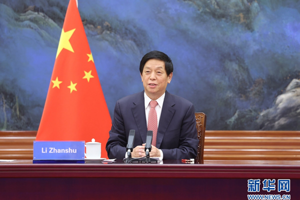全国人大常委会委员长栗战书27日在北京人民大会堂以视频方式同委内瑞拉全国代表大会主席罗德里格斯举行会谈。