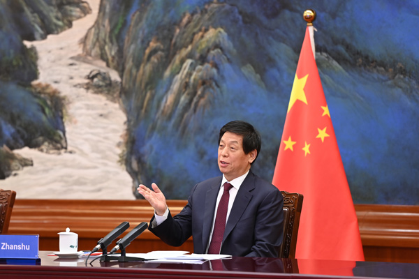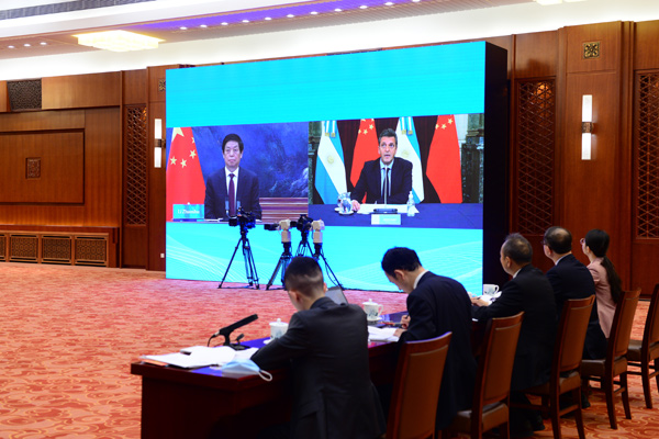 全国人大常委会委员长栗战书14日在北京人民大会堂以视频方式同阿根廷众议长马萨举行会谈。