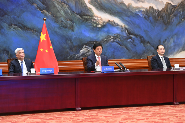 全国人大常委会委员长栗战书19日在北京人民大会堂以视频方式同马达加斯加国民议会议长克里斯蒂娜举行会谈。
