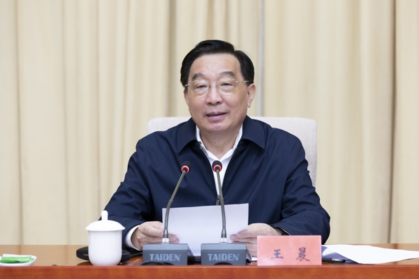 5月19日,中共中央政治局委员、全国人大常委会副委员长、中国法学会会长王晨在河北省张家口市出席“2021年青年普法志愿者法治文化基层行”座谈会。戎珊 摄