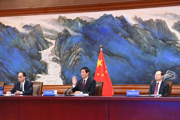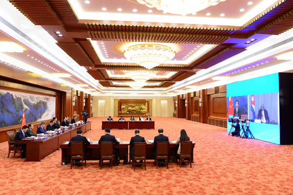 全国人大常委会委员长栗战书25日在北京人民大会堂以视频方式同古巴全国人民政权代表大会主席拉索举行会谈。