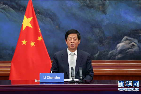 全国人大常委会委员长栗战书28日在北京人民大会堂以视频方式同老挝国会主席赛宋蓬举行会谈。
