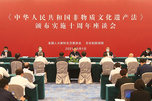座谈会由全国人大教科文卫委员会、文化和旅游部共同举办。中宣部、全国人大宪法法律委、全国人大常委会法工委、国家发改委、司法部、财政部等部门有关负责同志和非物质文化遗产传承人代表参加。