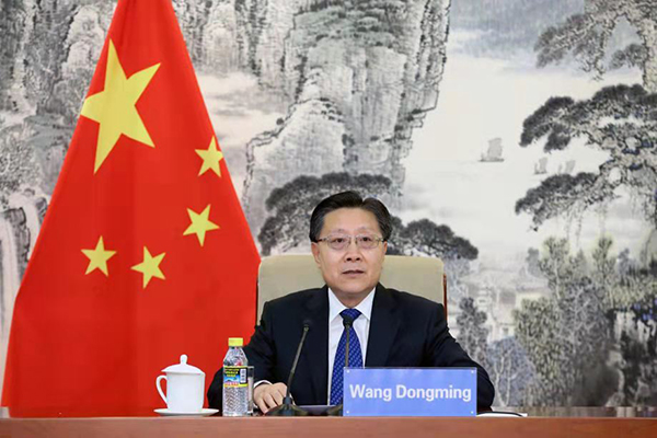 6月23日,全国人大常委会副委员长王东明在京出席全国人大与非洲四国议会线上研讨会开幕式并致辞。摄影 毕楠