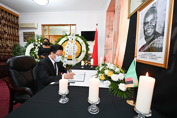 张春贤副委员长前往赞比亚驻华使馆吊唁赞比亚前总统卡翁达逝世。新华社记者李响 摄