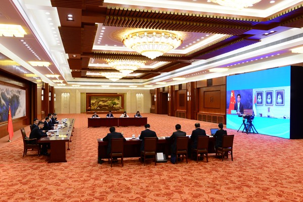 全国人大常委会委员长栗战书7日在北京人民大会堂以视频方式同阿联酋联邦国民议会议长萨格尔举行会谈。马增科 摄