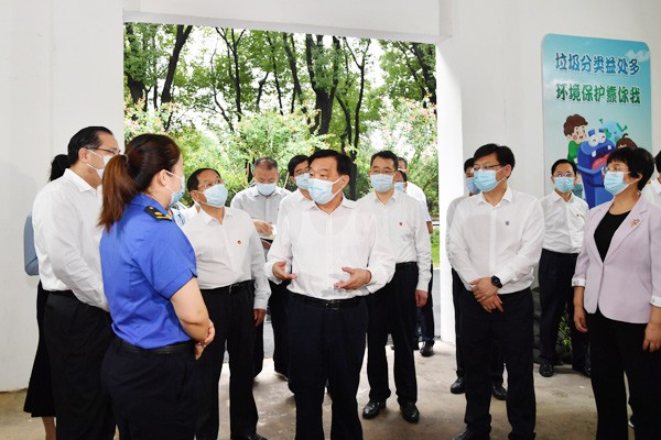 7月7日,中共中央政治局委员、全国人大常委会副委员长王晨率全国人大常委会执法检查组在襄阳市育红社区了解生活垃圾分类情况。摄影/湖北日报 魏莱