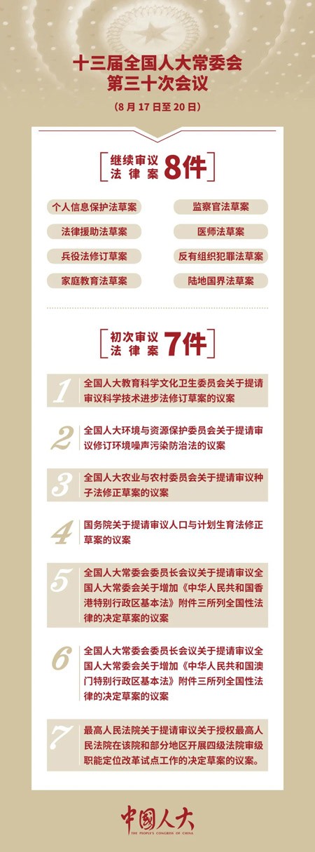 十三届全国人大常委会第九十八次委员长会议决定,十三届全国人大常委会第三十次会议将于8月17日至20日在北京举行。