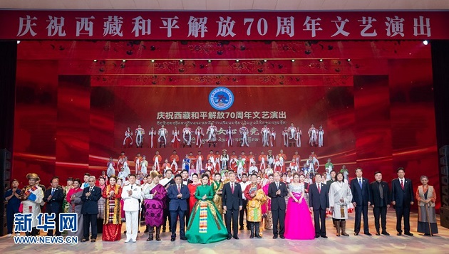 8月19日,庆祝西藏和平解放70周年文艺演出《西藏儿女心向党》在西藏人民会堂精彩上演。中共中央政治局常委、全国政协主席、中央代表团团长汪洋,与西藏自治区各族各界干部群众600余人一起观看演出。这是演出结束后,汪洋等走上舞台,祝贺演出成功,并与全体演职人员合影留念。新华社记者 翟健岚 摄