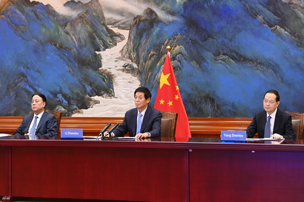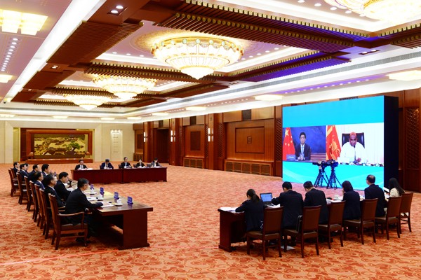 8月31日,全国人大常委会委员长栗战书在北京人民大会堂以视频方式同斯里兰卡议长阿贝瓦德纳举行会谈。新华社记者 姚大伟 摄