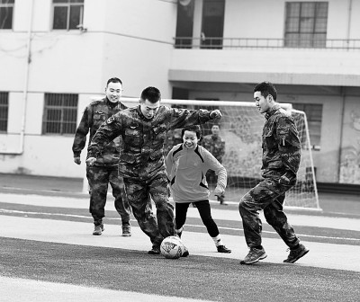 陆军第83集团军某旅官兵与驻地学生进行足球游戏。贾方文 摄/光明图片
